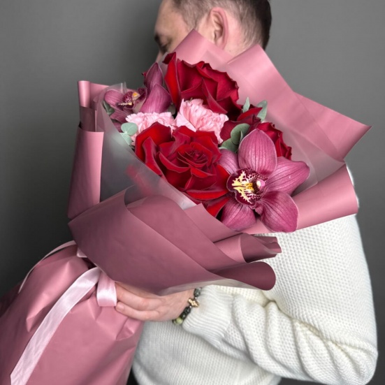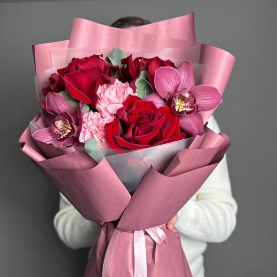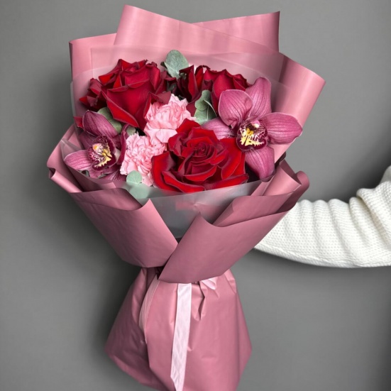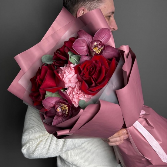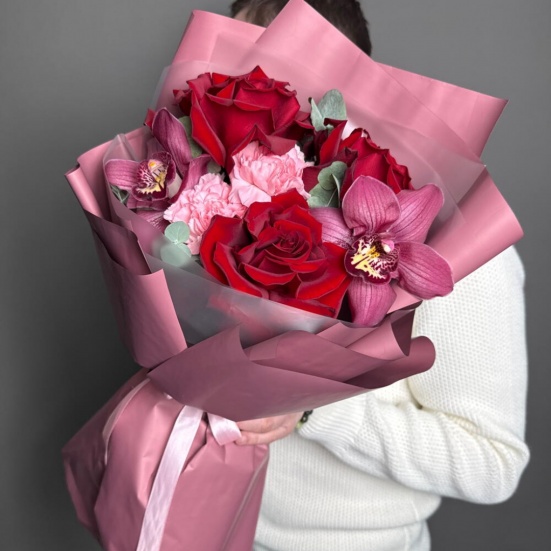 Букет из 3 красных роз, орхидей и диантуса в Великих Луках