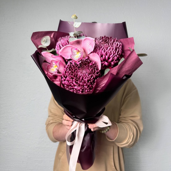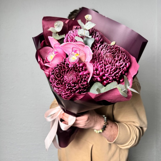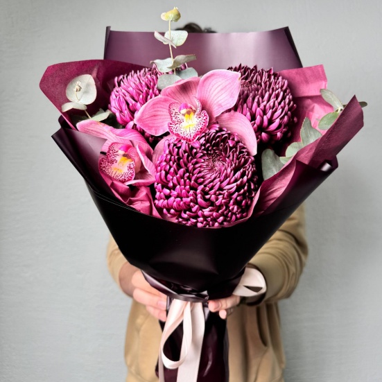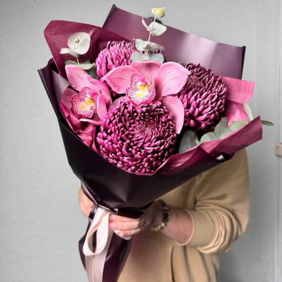 Букет из хризантем Бигуди и Орхидей в Великих Луках